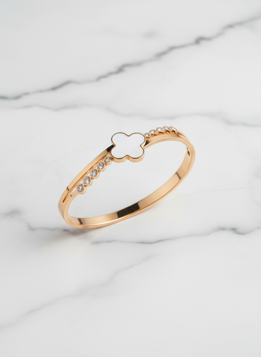 Curved design Stylish "ROSE GOLD " bracelet made from high-quality stainless steel, featuring a white clover charm with shiny crystal stones. Elegant, durable and comfortable